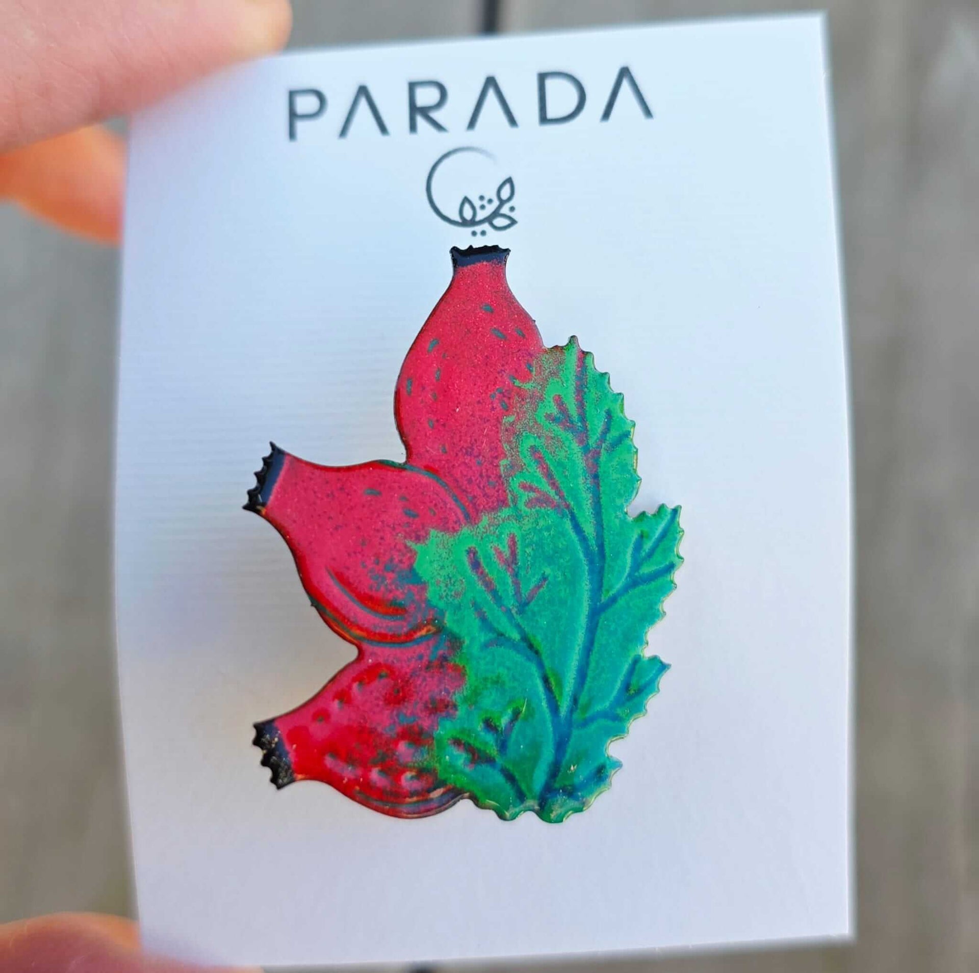 The rosehip brooch in red and green makes a natural statement! It is hand-painted on an enameled stainless steel base. You will love its delicate design. I used a jewelry plasma welder to attach the pin to the steel base so as to secure the best possible connection.